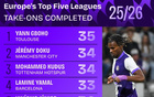 五大联赛成功过人排行:格博霍居首,多库、库杜斯并列次席