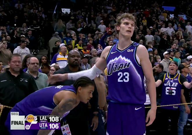 还有一点,爵士在最后时刻打出一波7:0,把本来已经没有悬念的两位数分差给拉回来了,而此时关键时刻的绝杀球,本来湖人只领先2分,时间还剩下5.8秒,爵士是绝对有机会打进最后一攻的。